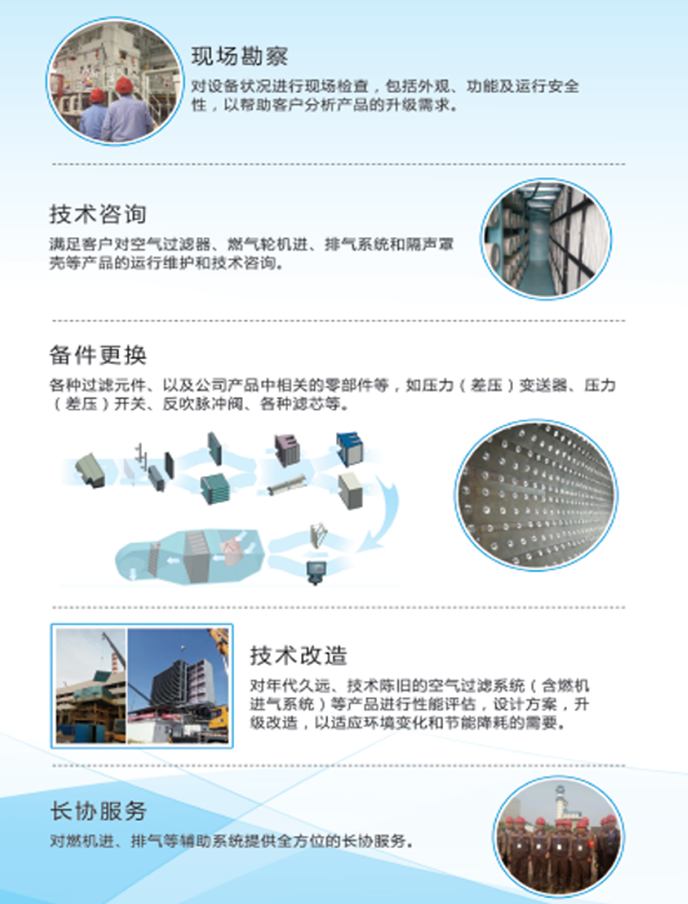 我們在燃?xì)廨啓C輔助系統(tǒng)維護、改造、升級等方面有著豐富的經(jīng)驗,能夠?qū)υO(shè)備的設(shè)計、制造、安裝、質(zhì)量、進度與安全進行有效的把控;對年代久遠(yuǎn)、技術(shù)陳舊的空氣過濾系統(tǒng)等產(chǎn)品進行性能評估,提供解決方案,進行升級改造,以適應(yīng)環(huán)境變化和節(jié)能降耗的需要,目前已完成國內(nèi)多個電廠的改造升級項目。